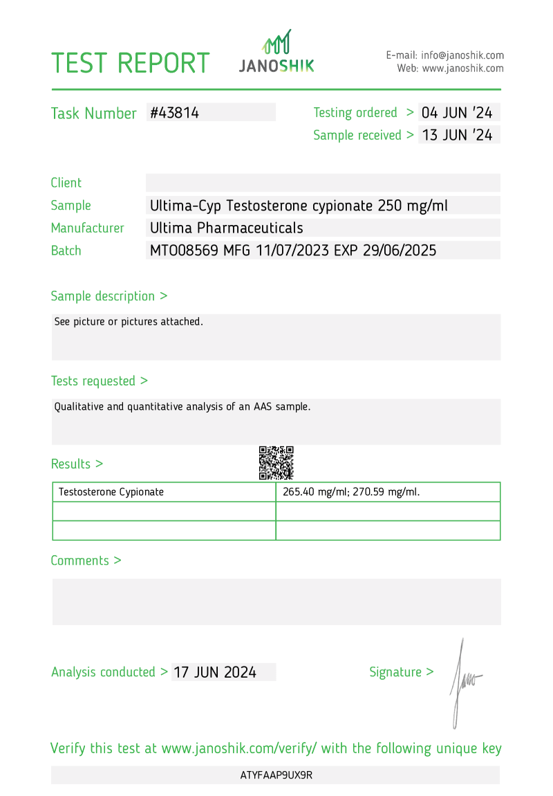 Ultima-Cyp – injectable anabolic steroid with prolonged action (about 2 weeks), the use of which is accompanied by a significant increase in muscle mass, endurance, performance and power.